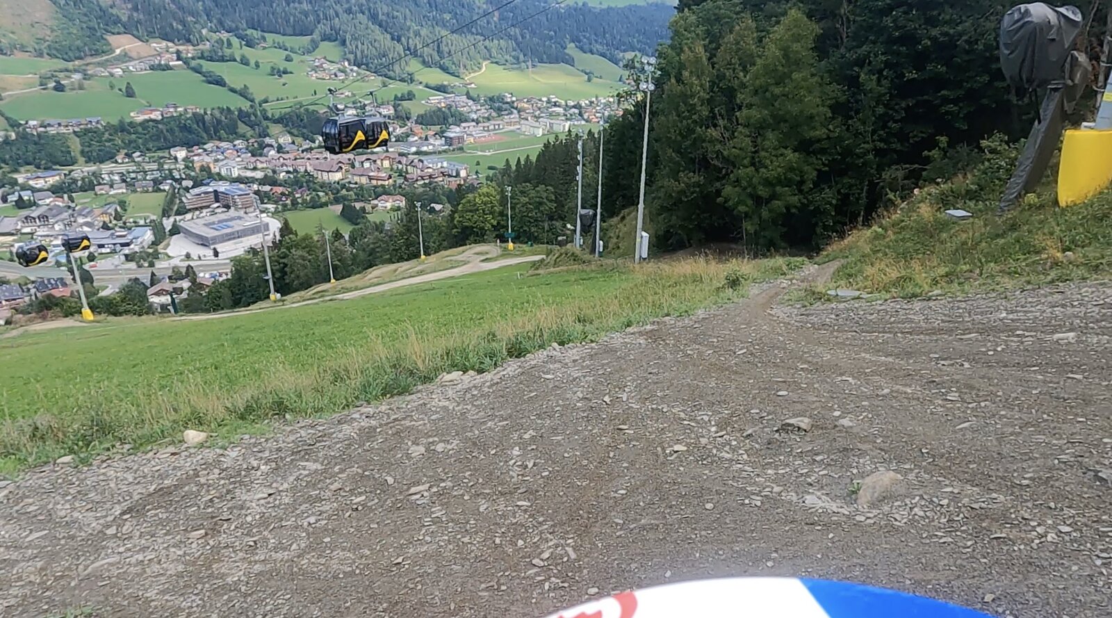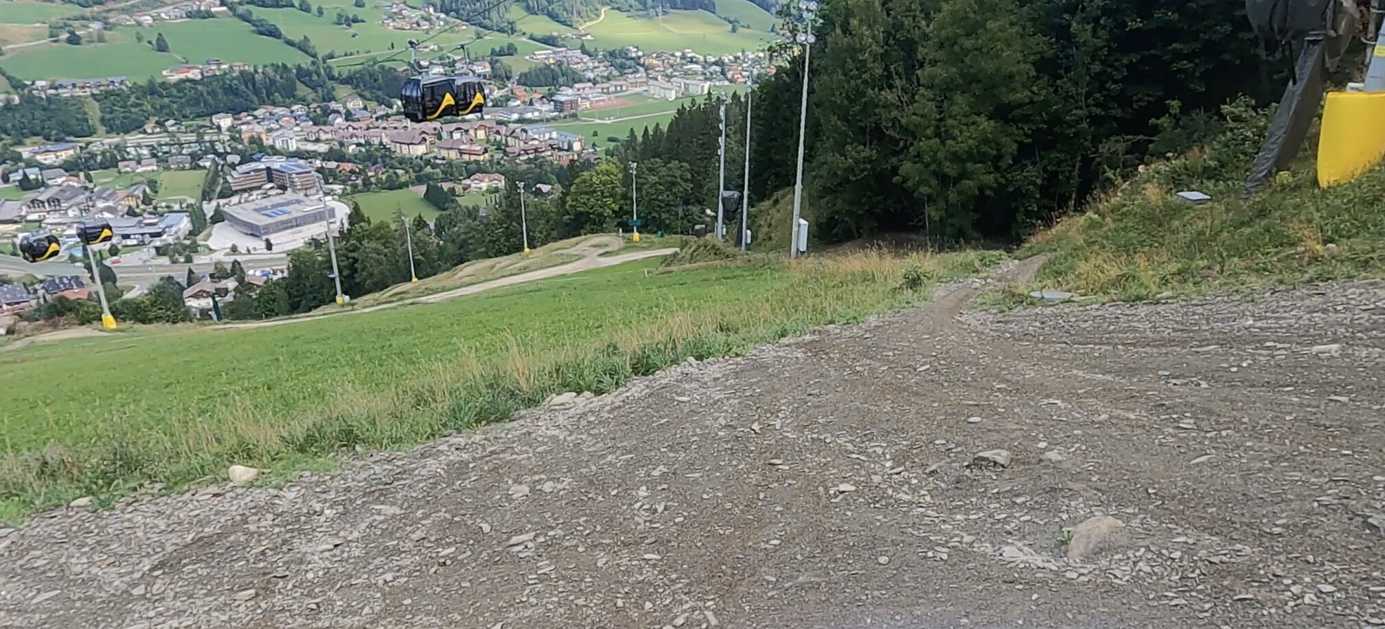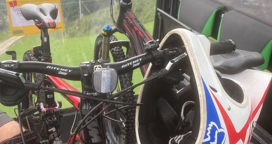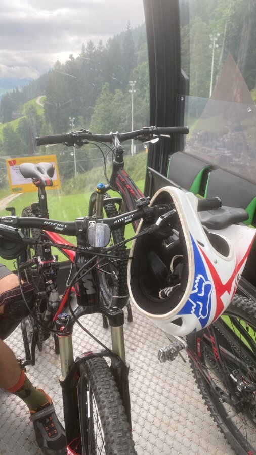 Von der Gondel aus stachen uns andere Biker auf den schwierigeren Trails ins Auge. Weite Sprünge, unebene Verhältnisse und FahrerInnen mit professionellen Downhillbikes ließen uns daran zweifeln, die rote, geschweige denn, die schwarze Strecke auch befahren zu können. Wir haben uns dann aber trotzdem überwunden und uns den roten Trail hinuntergewagt. Ab dieser Schwierigkeitsstufe ist dann ein Fullface Helm vorgeschrieben.