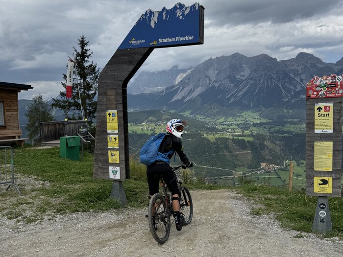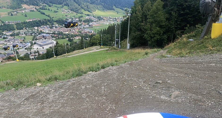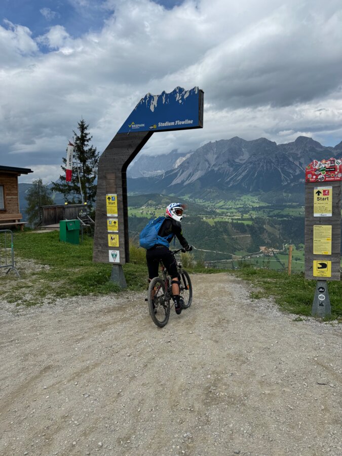 Direkt nach der Einfahrt wussten wir auch warum. Größere Steine, Wurzeln, sehr ruppige Streckenverhältnisse und immer mal wieder Situationen, in denen man mal nicht mehr mit den Reifen auf dem Boden ist, verlangten uns alles ab. Es besteht zum Glück die Möglichkeit mehrmals Pausen einzulegen, die waren für uns schon ziemlich wichtig. Auch die Möglichkeit auf den leichteren Trail zurückzuwechseln wurde an mehreren Stellen geboten. Trotzdem blieben wir auf dem Trail und erreichten ohne weitere Schwierigkeiten das Ziel, welches man sonst im Winter über den Zielhang der Planai erreichen kann.