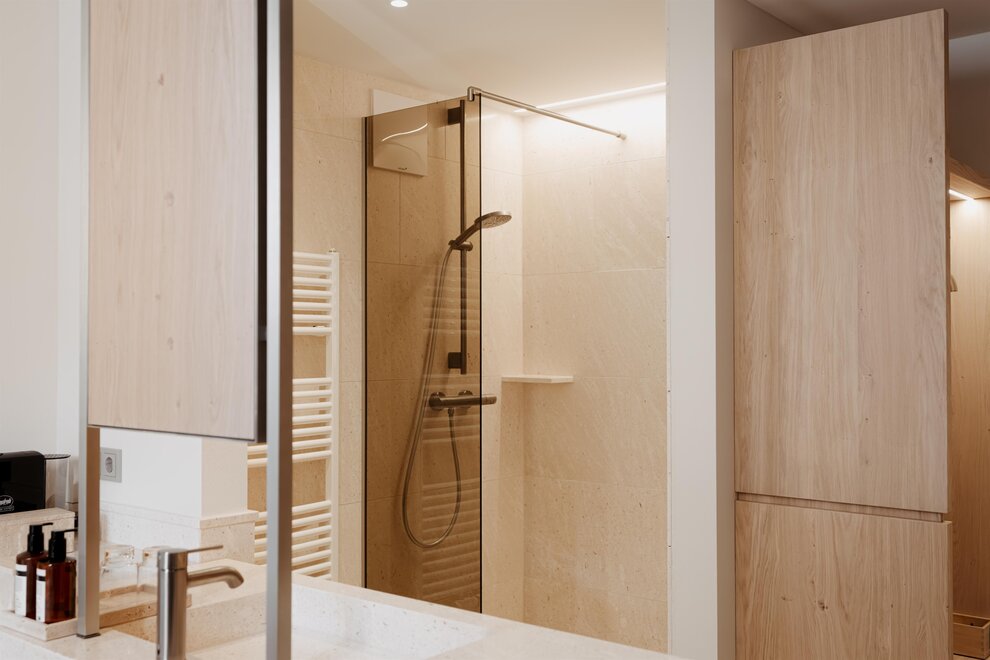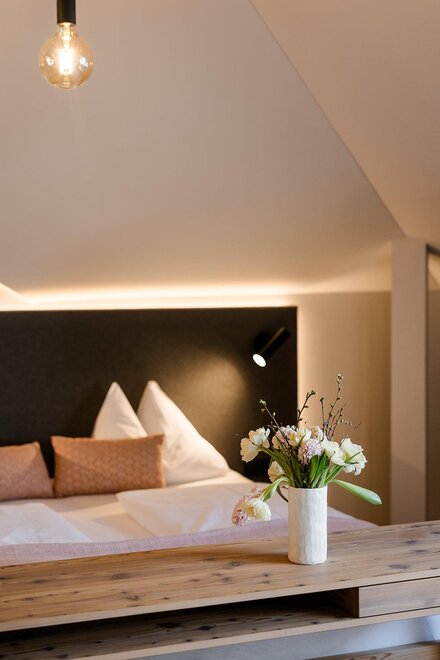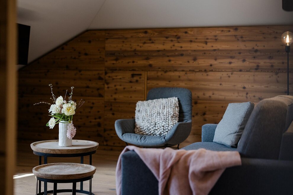 Nové od zimy 18/19: Prostorný loftový apartmán s odděleným obývacím prostorem, dřevěná podlaha, přírodní dřevěný nábytek, 10 m² soukromá a zastřešená loftová terasa, 2x plochá obrazovka s kabelovou televizí, W-Lan (rychlá optická síť), psací stůl, pohodlný sedací kout, minibar, trezor, telefon, koupelna se sprchou, fénem na vlasy a sušákem na ručníky, samostatné WC