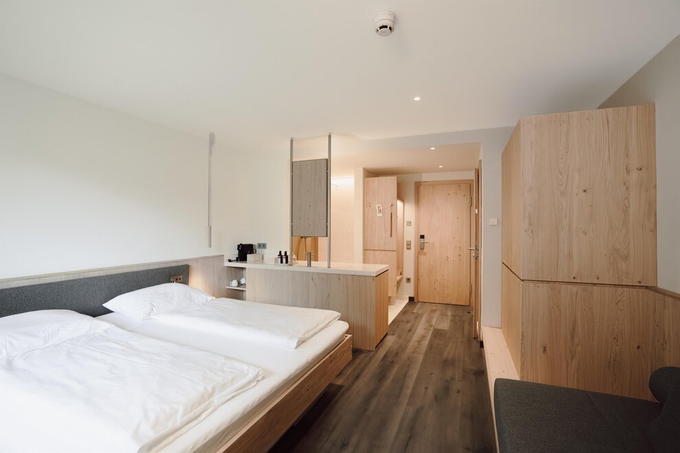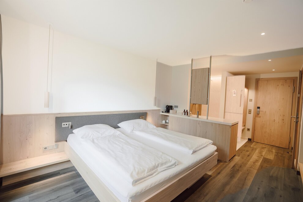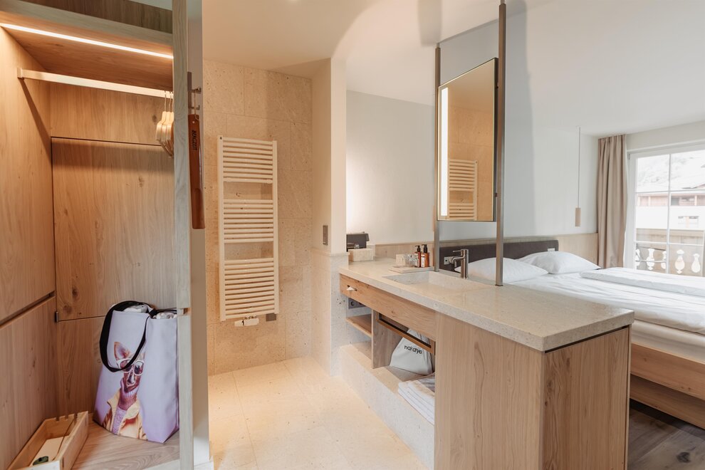 NOVINKA od června 2025! Příjemný dvoulůžkový pokoj s prostornou manželskou postelí, přírodní dřevěnou podlahou, útulným posezením, soukromým a zařízeným jihovýchodním balkónem s výhledem na hory, Wi-Fi, hotelovým trezorem, kávovarem, minibarem, telefonem, plochou televizí, otevřenou koupelnou s přírodním kamenem, sprchou, fénem na vlasy, sušákem na ručníky, samostatným WC, včetně 3/4 penze