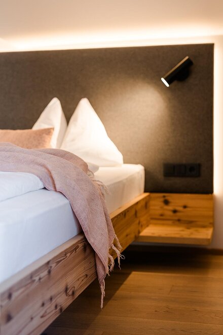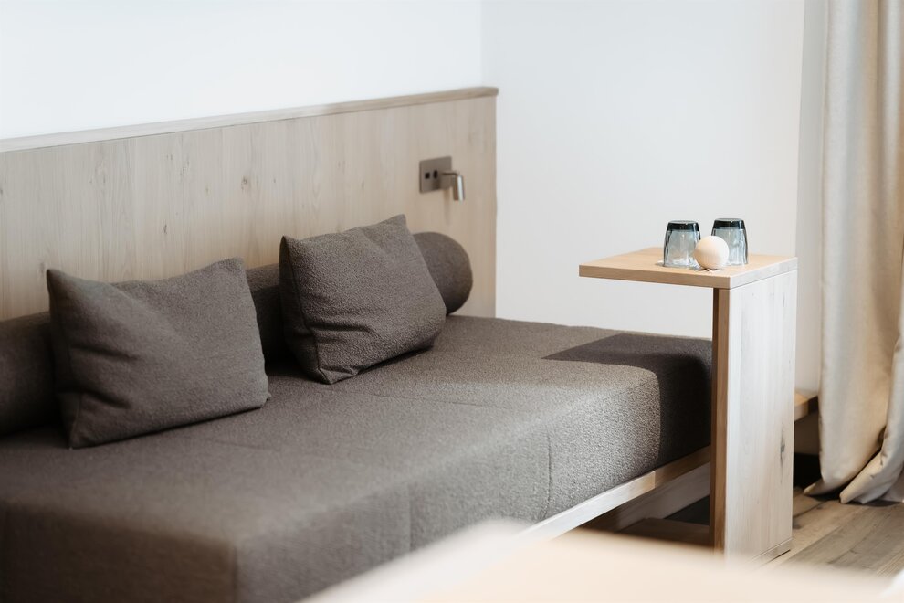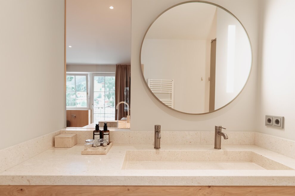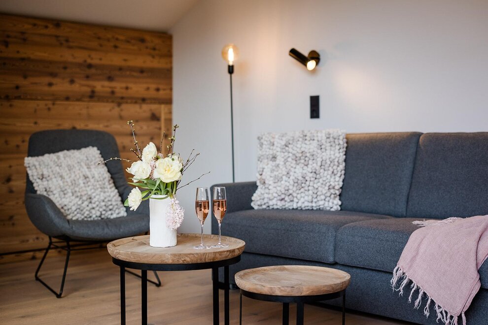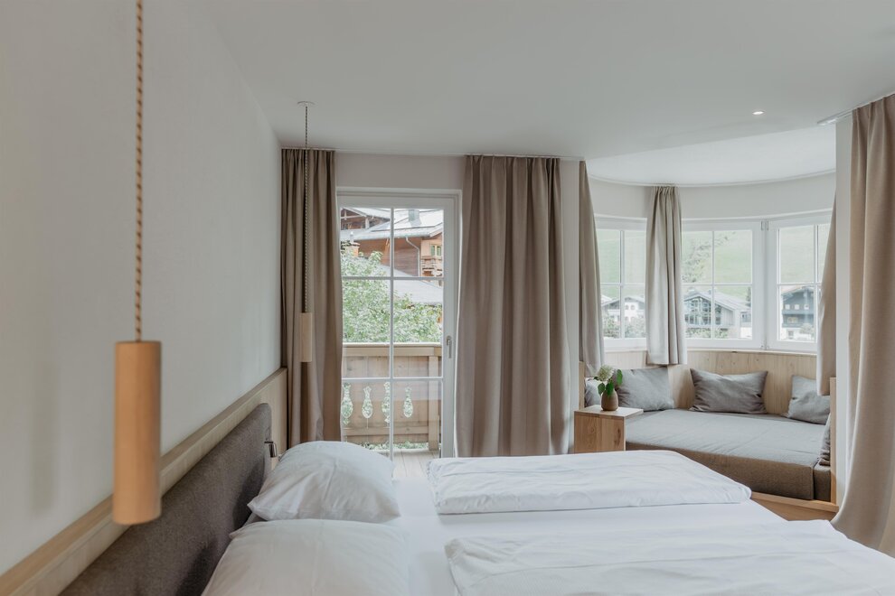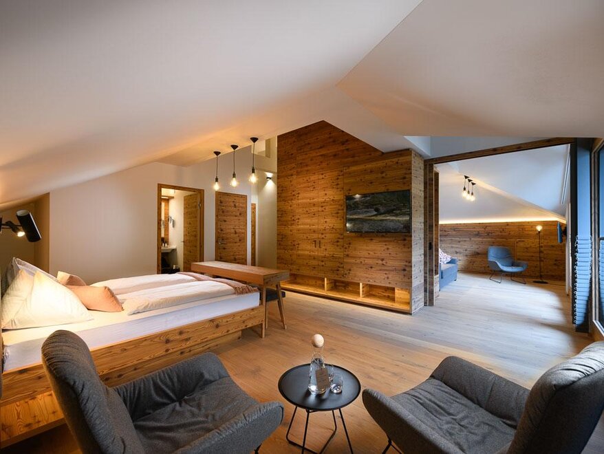 NOVÉ od června 2025! prostorné, nové rodinné apartmá s dalším dvoulůžkovým pokojem (1x velká manželská postel, 1x jednolůžko nebo dvoulůžko), přírodní dřevěná podlaha, útulná sedací souprava, soukromý a zařízený balkon s výhledem na hory, W-Lan, hotelový trezor, telefon, TV, minibar, čerstvá voda, kávovar, velká moderní koupelna s přírodním kamenem, sprchou, dvojitým umyvadlem, samostatné WC, fén na vlasy, sušička ručníků, včetně 3/4 penze