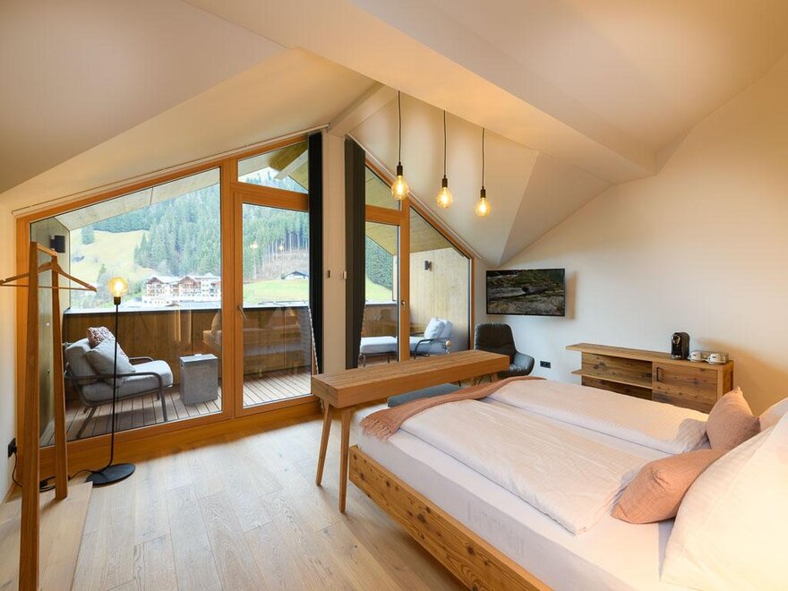 Nově od zimy 18/19: Nebeský loftový dvoulůžkový pokoj s ohromujícím výhledem na hory, dřevěná podlaha, přírodní dřevěný nábytek, 10 m² soukromá a zastřešená loftová terasa, televize s plochou obrazovkou a kabelovou televizí, Wi-Fi (vysokorychlostní optická síť), psací stůl, útulná sedací souprava, minibar, trezor, telefon, koupelna se sprchou, vysoušeč vlasů a sušička ručníků, WC