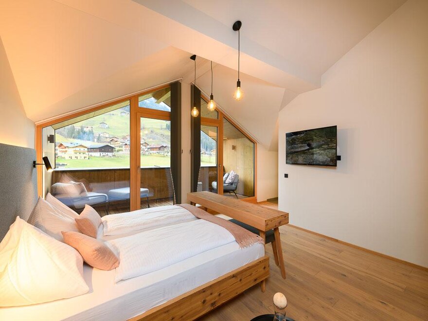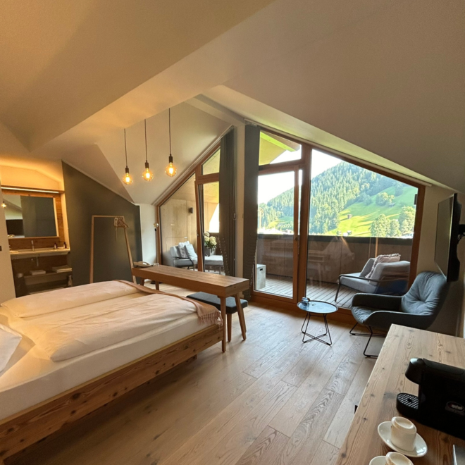NOVÉ od června 2025! Světlý panoramatický suite, prostorná manželská postel, podlaha z přírodního dřeva, útulný relaxační prostor v erkovém věžičce s úchvatným výhledem na hory, soukromý a zařízený balkon, W-Lan, hotelový trezor, telefon, plochá obrazovka, mini lednička, kávovar, otevřená koupelna s přírodním kamenem, sprcha, samostatné WC, fén na vlasy, sušička ručníků, včetně 3/4 pension