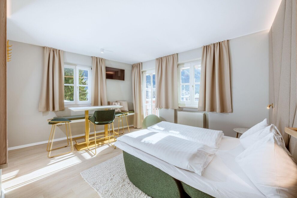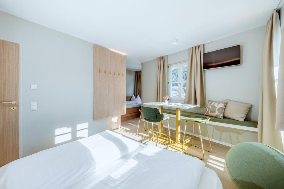 For up to 5 people: Two-room apartment with an entrance area, shower, WC, kitchenette, living/sleeping area with a double bed and a single bed for the 5th person, 1 bedroom with a double bed, balcony, safe, hairdryer, 2x cable TV, and telephone.