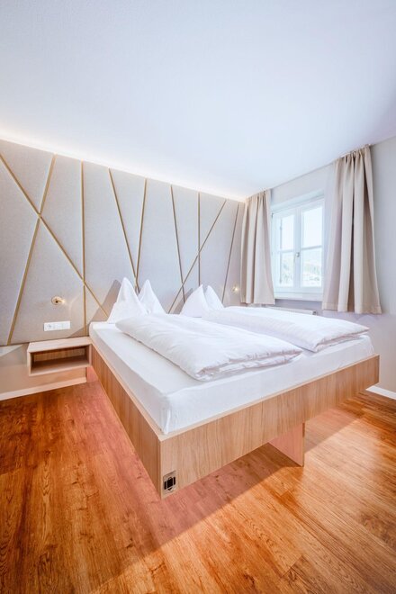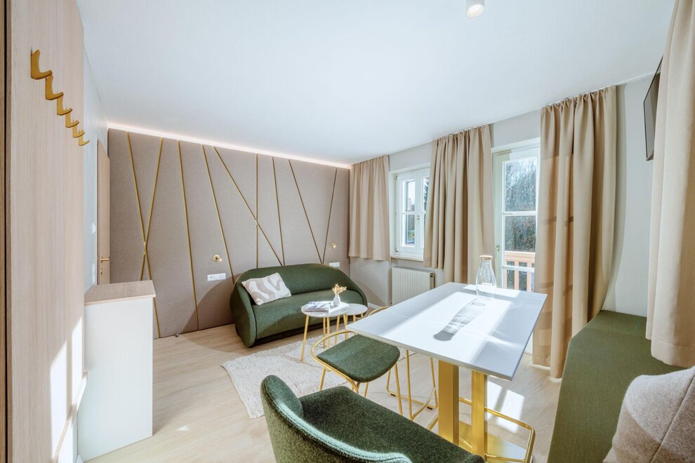 For up to 4 people on the third floor with an attic: Two-room apartment with an entrance area, shower, WC, kitchenette, living/sleeping area with a double sofa bed, bedroom with a double bed, balcony, safe, hairdryer, 2x cable TV, and telephone.