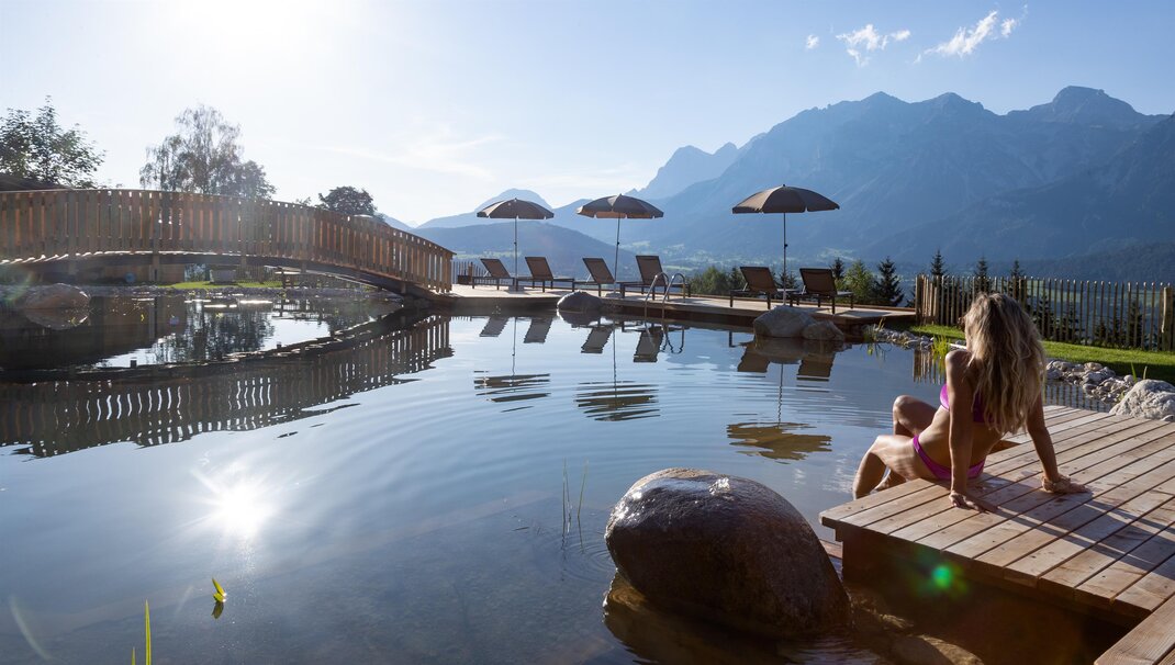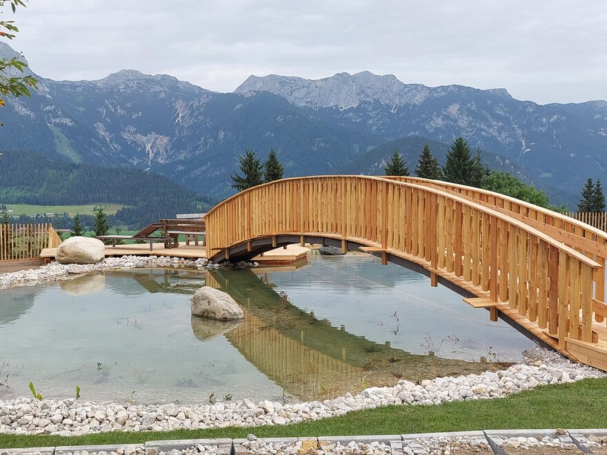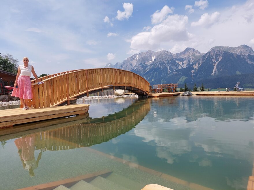 Hotel's own swimming pond with bridge, sun loungers, parasols, shower & toilet