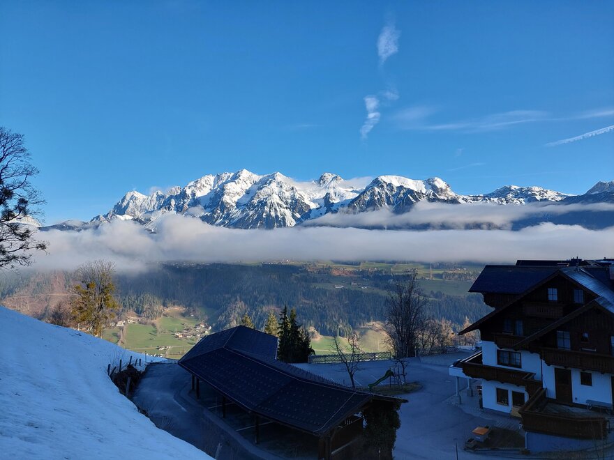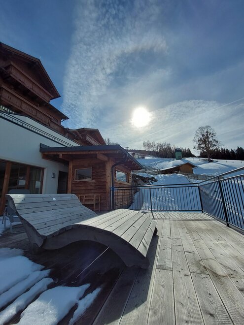 Spacious Sauna Area including Finnish Panoramic Sauna with view to the Dachstein massif, herbal steam sauna and infrared cabin