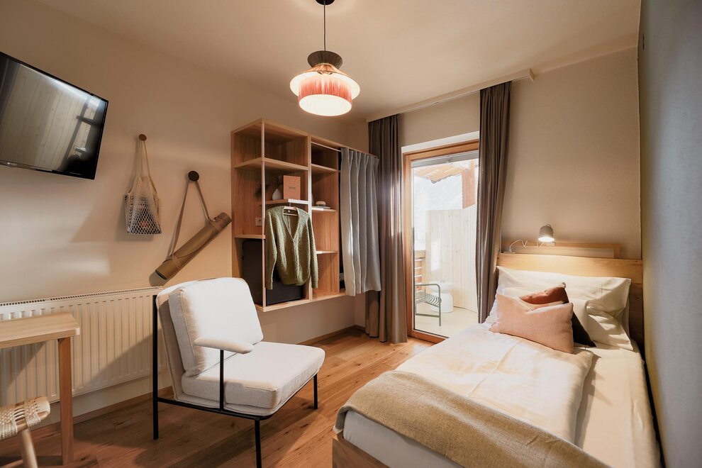 Dvoulůžkový pokoj, cca 22m², s jasným designem a útulnou atmosférou. Flow double se nachází v přízemí, s terasou do zahrady. Hlavně zde jsou psi srdečně vítáni. Všechny naše pokoje jsou vybaveny kuchyňským koutem, sprchou a pohodlným lounge křeslem.