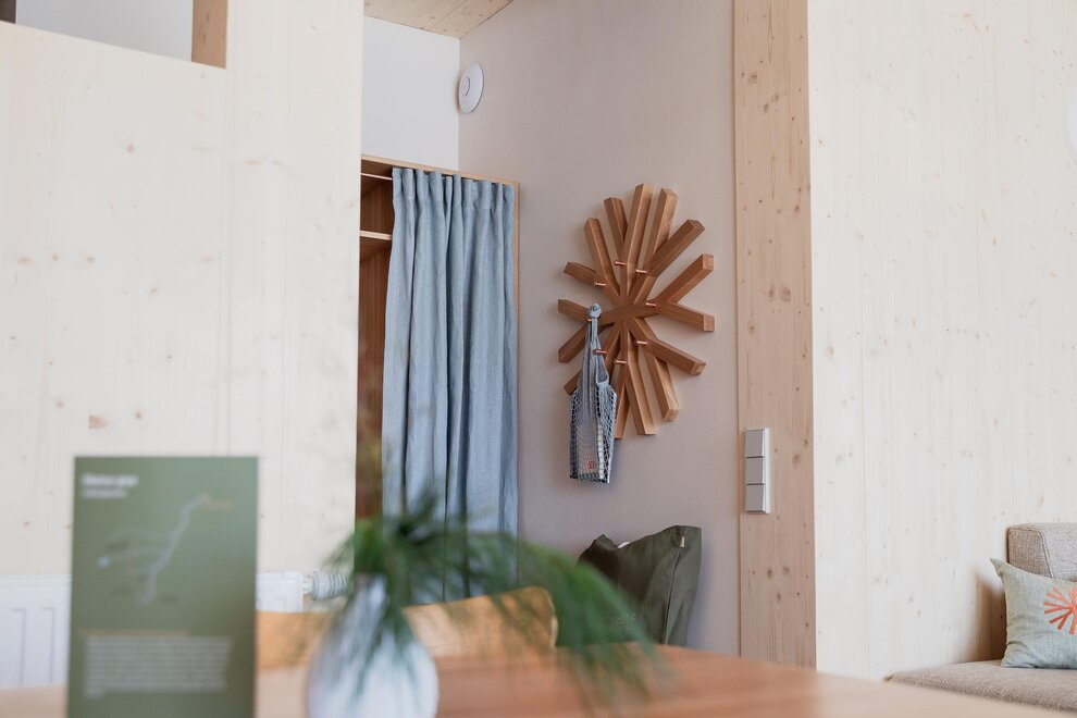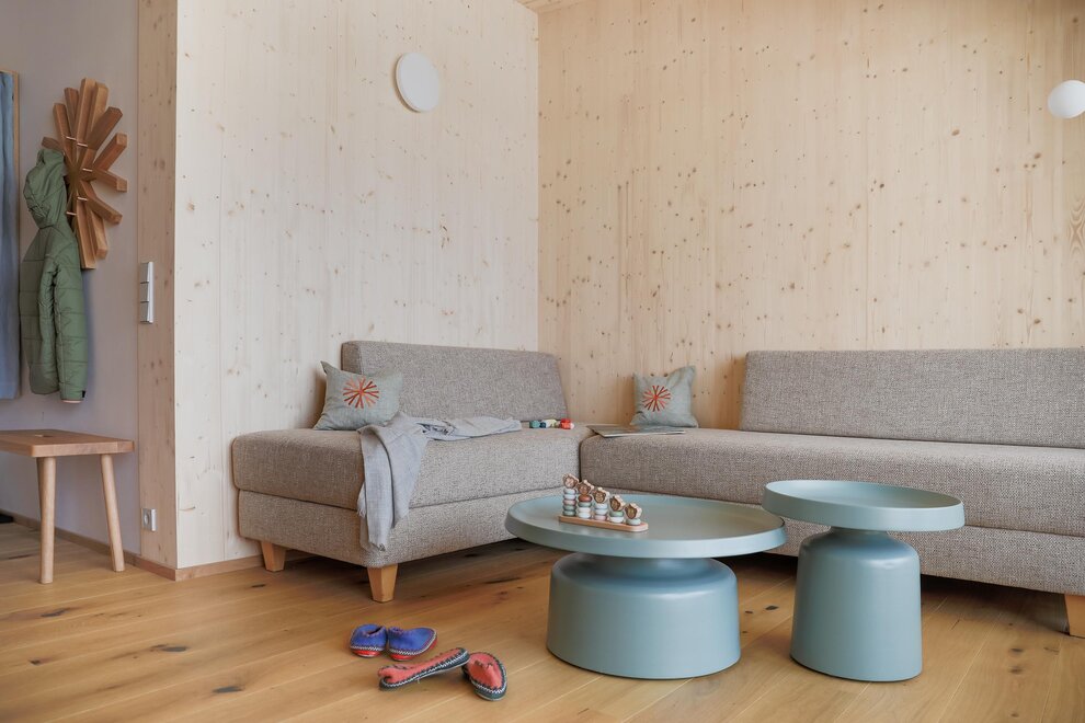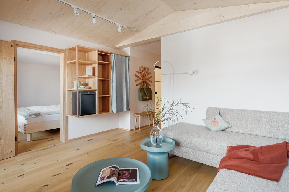 design, teplá dřevěná podlaha a příjemné látky v přírodních tónech vytvářejí útulnou obytnou atmosféru.
