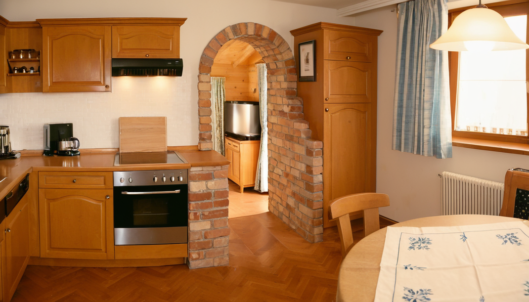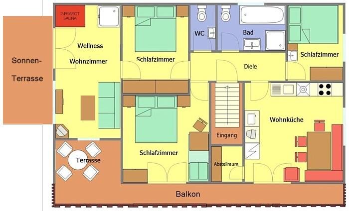 Apartment Enzian ideal for 3-5 people (70m²): Entrance hall, living room with dining area and fully equipped kitchen - all dishes, electric stove with oven, dishwasher, fridge and freezer, coffee maker, kettle, microwave oven and radio. 2 bedrooms with double beds (if required cot or extra bed) and comfortable living room with large couch and LCD TV, bathroom with shower and toilet, infrared sauna for your wellness pleasure and terrace with garden furniture.