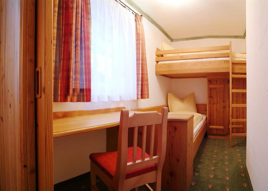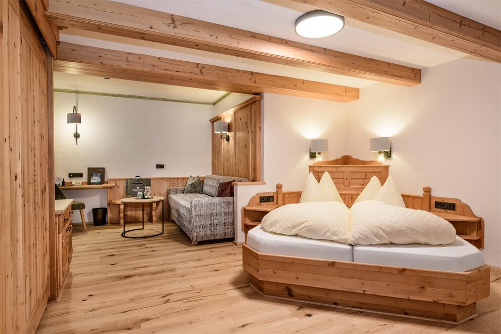 Familienzimmer im alpenländischen Stil, mit extra Kinderzimmer (teils Stockbetten), Badewanne und getrenntem WC, Telefon, TV, Radio, Safe, Fön, Sitzecke und Balkon