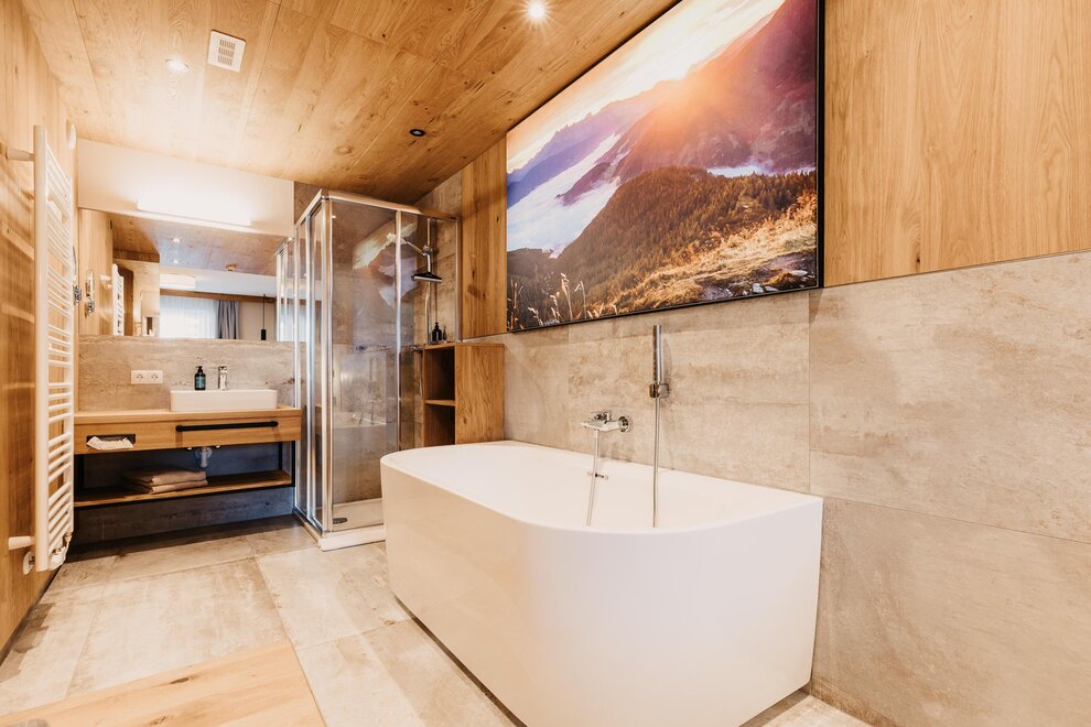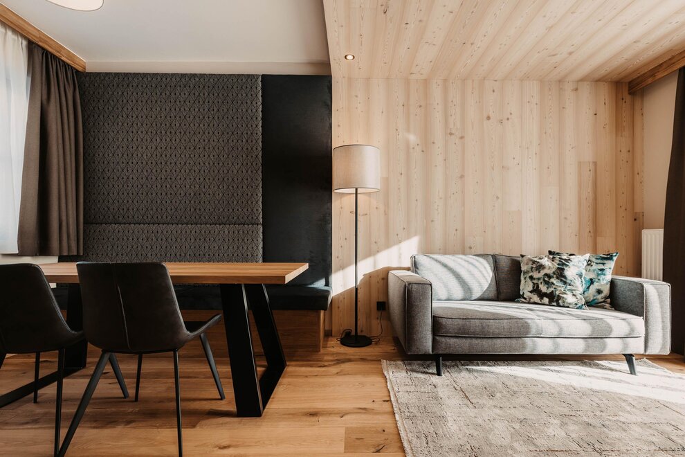 Dieses Suite Apartment bietet Ihnen 2 Schlafräume mit gemütlichen Boxspringbetten, eine große Wohnküche zum Kochen und Relaxen sowie einer Terasse (31m²). Lage: Haus LÄRCHE KG, Süd/Tal, Terasse südseitig,
