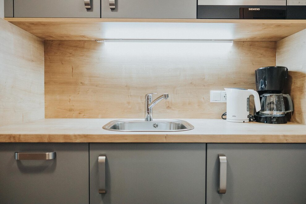 Radiowecker, Wohn-/Schlafräume kombiniert, Sitzgruppe, Bettwäsche vorhanden, Geschirr vorhanden, Geschirrspülbecken, Kabelfernsehen, Radio, Telefon, Kochnische, Kaffee-Maschine, Dunstabzug, Gefriermöglichkeit, Kühlschrank, Fernseher, Elektroherd, Balkon