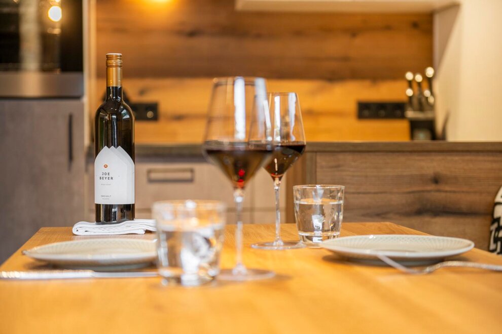 The spacious apartment invites you with a double bedroom with a box spring bed made of reclaimed wood and gold leaf elements, a separate twin room with 2 single beds, a living room with a fully equipped kitchen to a restful night. The sheep's wool bed linen with Swiss stone pine flakes lets you come to rest.