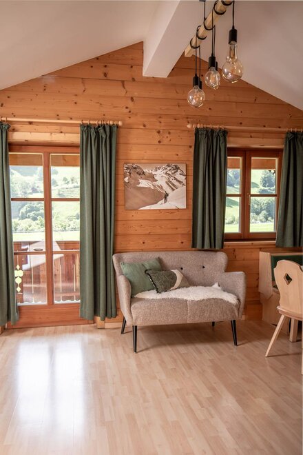 Cozy room 16 m² with double bed and sleeper chair, cable TV, shower/WC, balcony with terrace furniture. In the center of Großarl. The room has a coffee capsule machine.