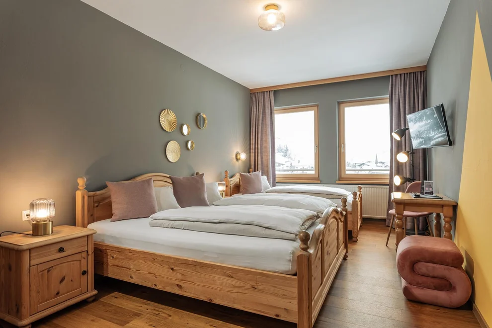 Cool double and multi-bed rooms await you in vintage design. Comfortable amenities with bath and toilet, TV, and Wi-Fi are standard in all rooms. All double rooms feature a south-facing balcony with views of the Hohe Tauern. Guests have access to free parking directly at the house. Pets are also welcome. Our breakfast buffet offers a wide selection of regional specialties for the perfect energy boost to start your day. Please note: We are a lively and cheerful location. Our Après-Ski Bar is open daily during the winter season.