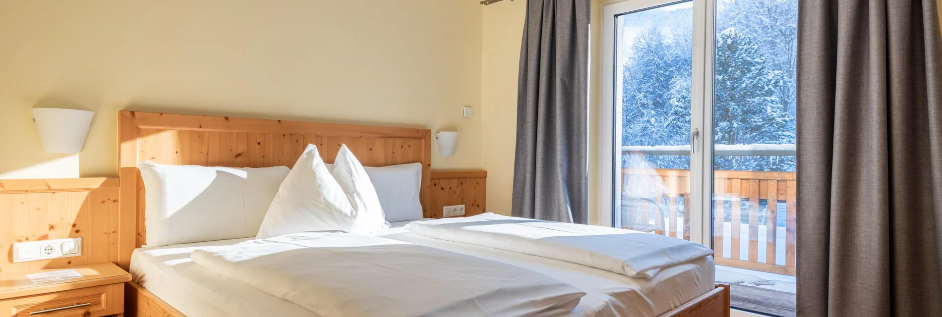 This cosy double room with queen-sized bed (1.60 x 2 m) is equipped with a bathroom with shower, WC and hairdryer, a large 32-inch TV, extra fast WIFI, comfortable seating and a sunny balcony. The view of the mountains guarantees a quiet location.
