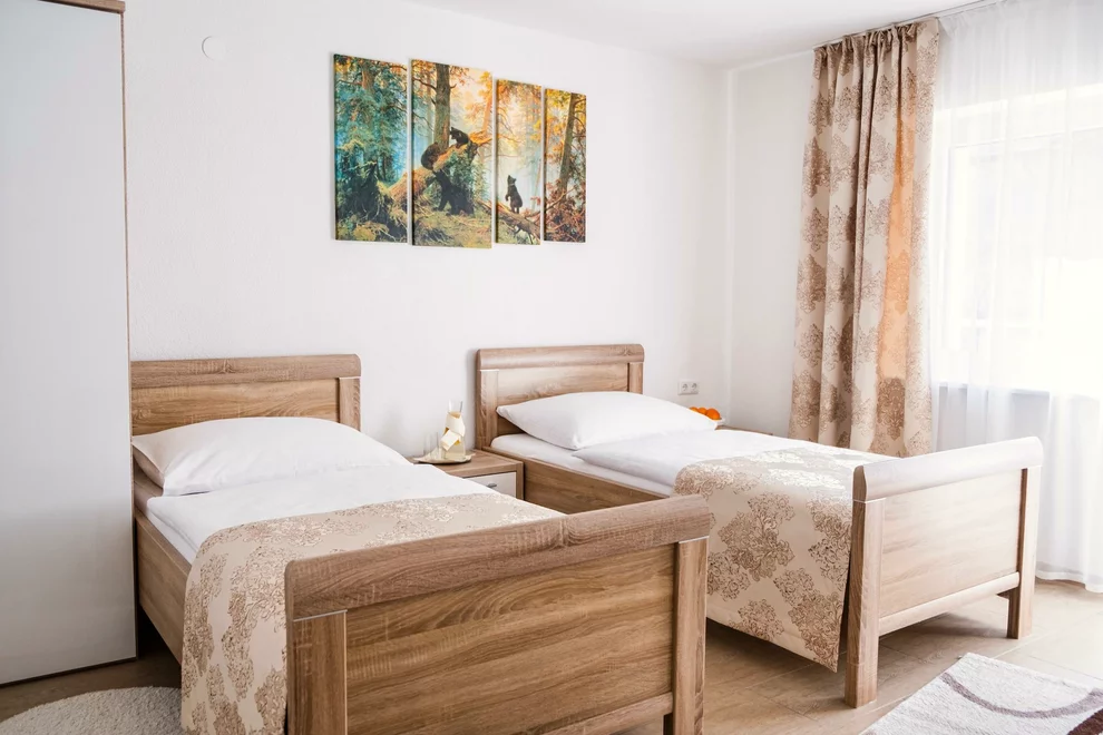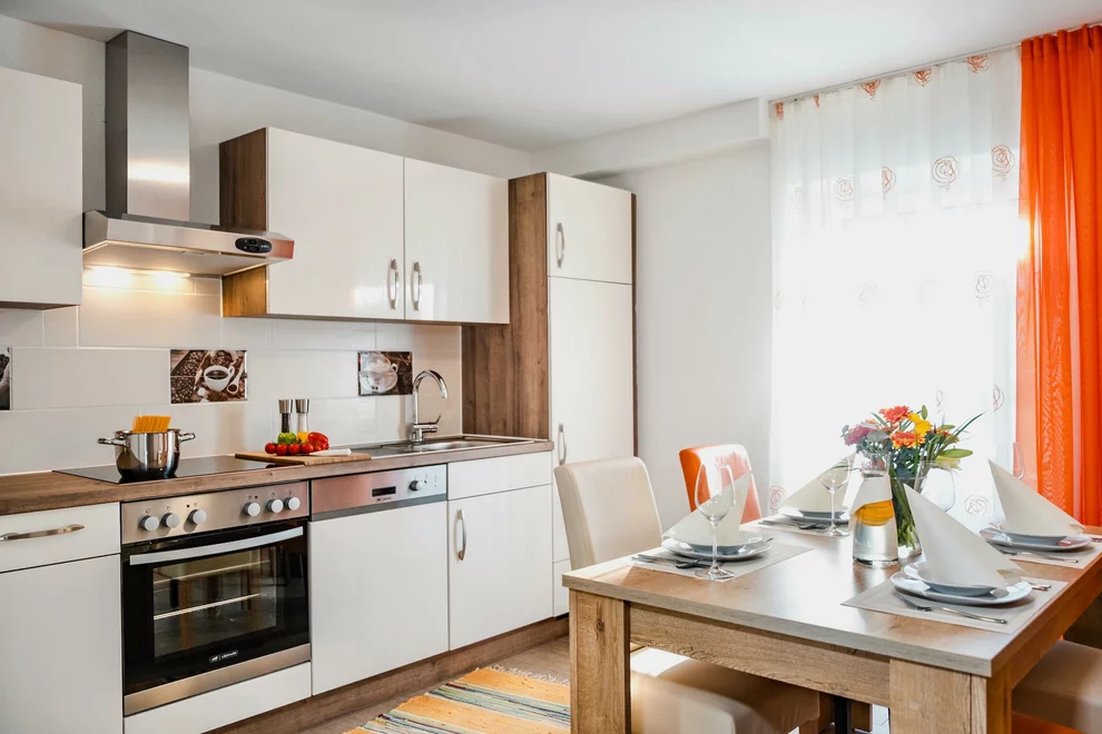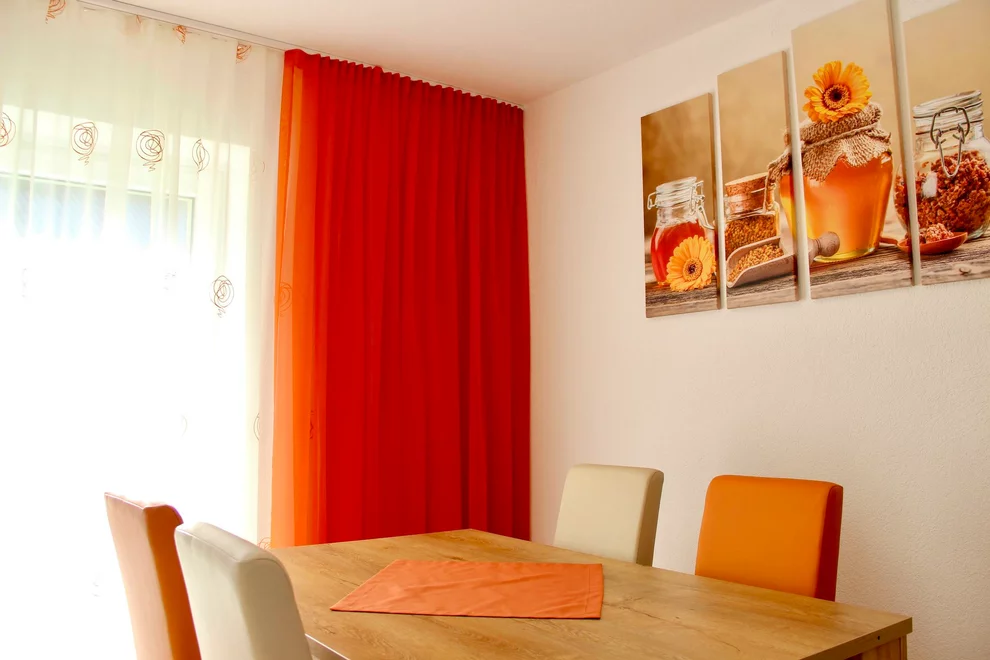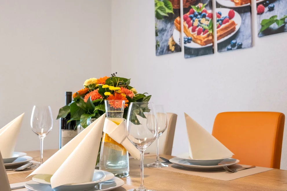 The apartment TOP 1 is located on the 2nd floor and features two separate bedrooms (king-size double bed each), a fully equipped kitchen with all the cooking utensils (incl. microwave, oven, kettle, dishwasher, filter-coffee machine), an own bathroom with a shower cabin, heated towel dryer and hair dryer, as well as a second WC.