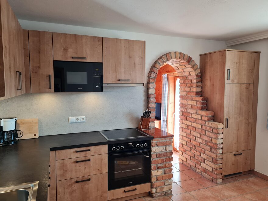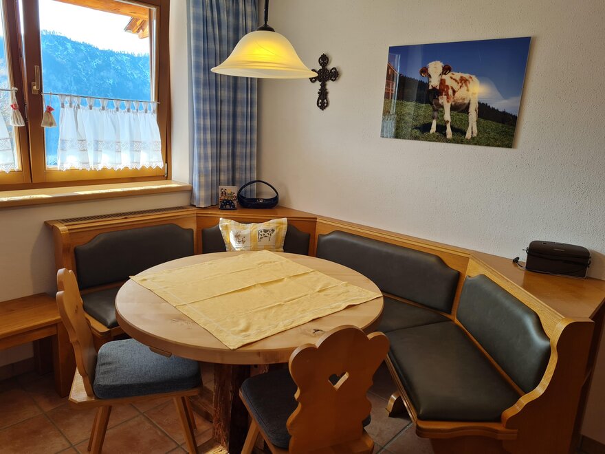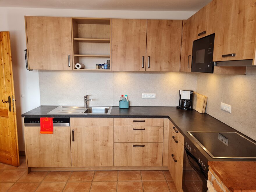 Apartment Bergblick ideal for 5-8 persons (about 100 m²): Entrance hall, living room with dining area and fully equipped kitchen - all dishes, electric stove with oven, dishwasher, fridge and freezer, coffee machine, kettle, microwave oven, satellite TV and radio. 3 bedrooms with double beds (if required cot and extra bed) and separate cozy wellness-living room (infrared sauna, shower, couch, LCD TV), bathroom with shower, bath and toilet, separate toilet. Great view from the balcony with covered, rustic sitting area.