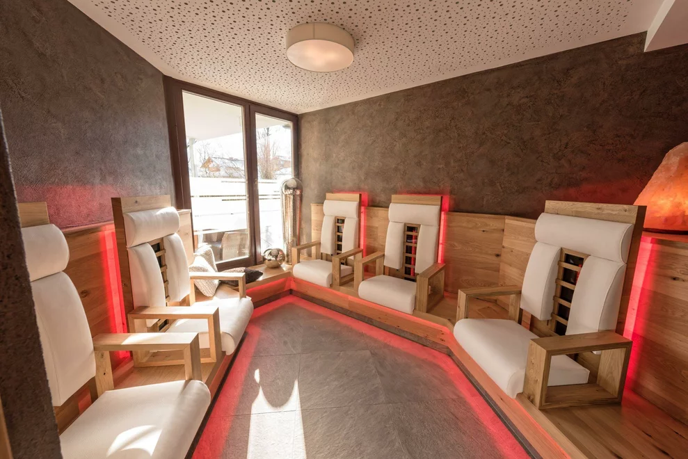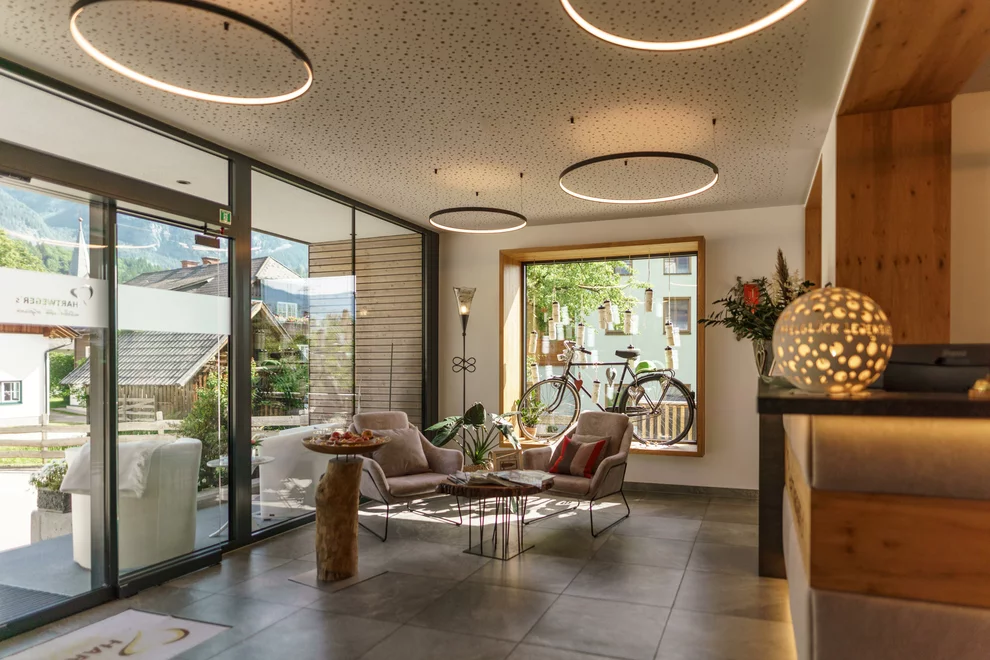 Large picture windows invite the beauty of the Schladming-Dachstein region into these spacious rooms. Natural light and stunning mountain views create an immediate sense of escape. Each room features a small balcony where you can breathe in the fresh alpine air, while untreated wooden furniture harmonizes perfectly with the surrounding nature. Some of the rooms feature carpeting that replicates the meadows and rocks, whilst others have wooden flooring (particularly ideal for allergy sufferers).