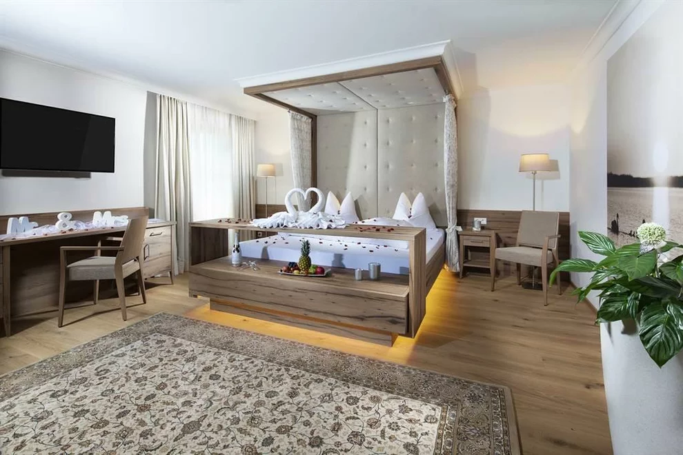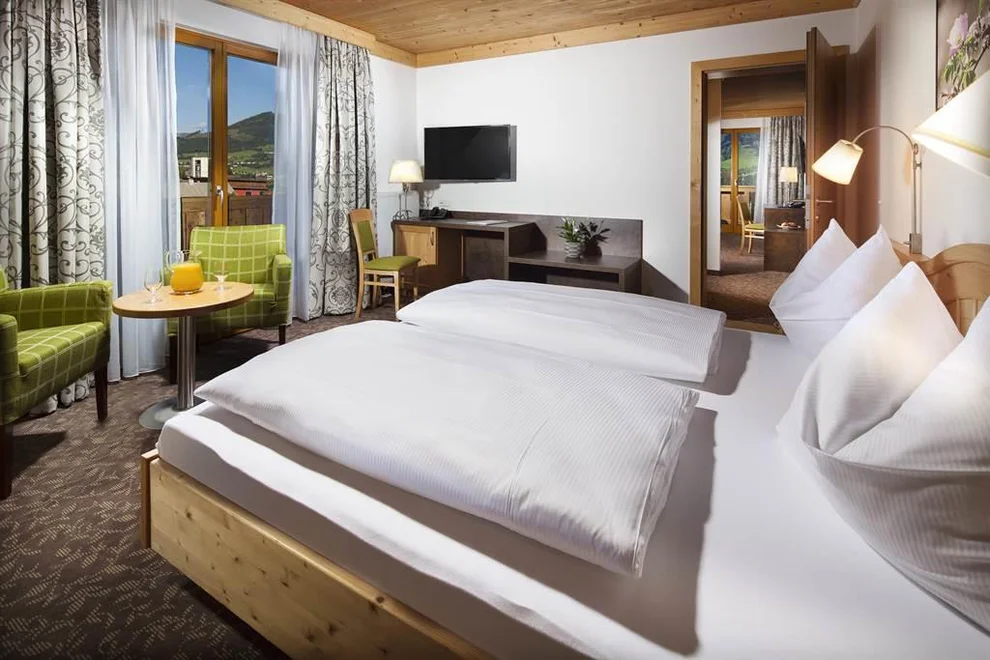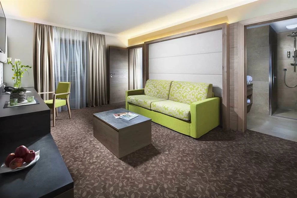Open space and pure comfort in a total of 40 square metres. Bright colours and modern oak elements ensure perfect comfort. The junior suite with bedroom (separable beds) and separate living area (pull-out sofa bed) is ideal for couples and families; extra space for another baby cot or an extra bed is available. The high-quality carpet flooring conveys a feeling of living at home. The junior suite also offers a cosy sitting area, desk, flat-screen TV with cable and radio reception, safe, telephone and free WLAN. The two bathrooms have a shower, hairdryer, bathrobe and a large mirror. There are two separate WCs. You can access the balcony through two doors that provide plenty of daylight and offer mountain views.Room/apartment features
