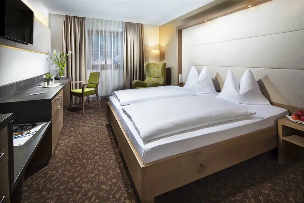 Our double room “Heukareck” will inspire you with its 25 to 27 square metres of true comfort. The room can accommodate two to four persons with a comfortable sitting area or pull-out sofa, desk, flat-screen TV with cable and radio reception, telephone, safe, and free WLAN. You can relax when you sleep! The high quality double bed guarantees a peaceful sleep. The bathroom has a hairdryer, bathrobe, shower and a WC. You can also enjoy a view from our double rooms – either from the terrace or the balcony.DOUBLE ROOM "HEUKARECK"