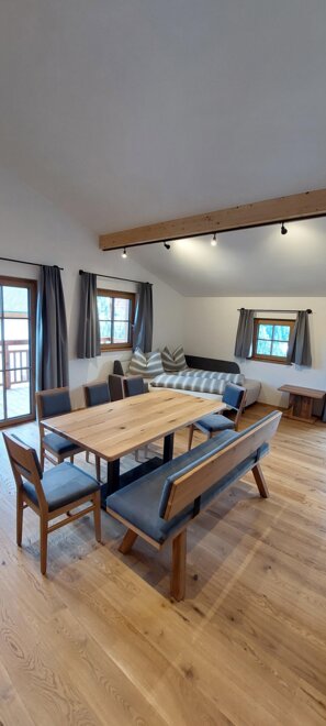 The large, lovingly furnished living area features a comfortable, easy-to-use pull-out sofa bed for 2 people and an extra wardrobe. The sofa is just as comfortable as a mattress.