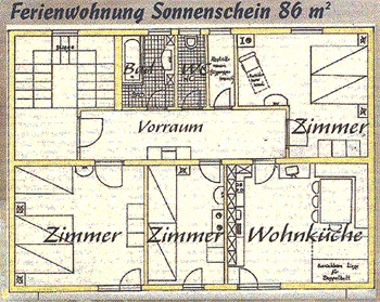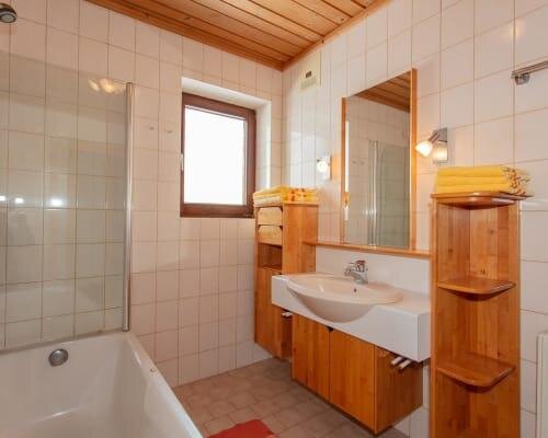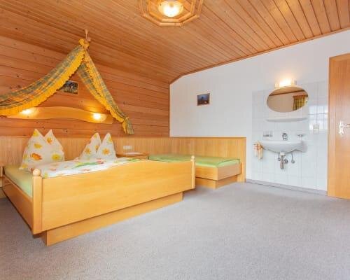 Our spacious “Sonnenschein” holiday apartment, furnished in a cozy country style, is perfect for a relaxing getaway in the mountains. Three comfortable bedrooms offer plenty of space: one with a double bed and single bed, one with two single beds, and one with a double bed and an extra sofa bed. Each bedroom has its own washbasin. Bathroom and toilet are separate; a washing machine is available for an additional fee.