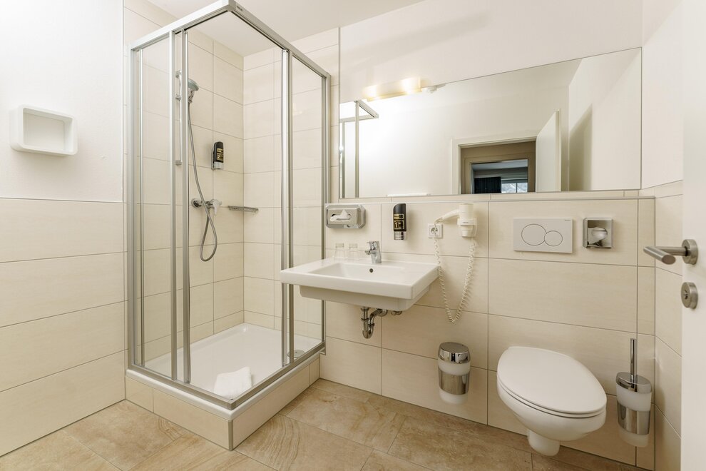 • bathroom with shower/toilet, hairdryer and towel dryer