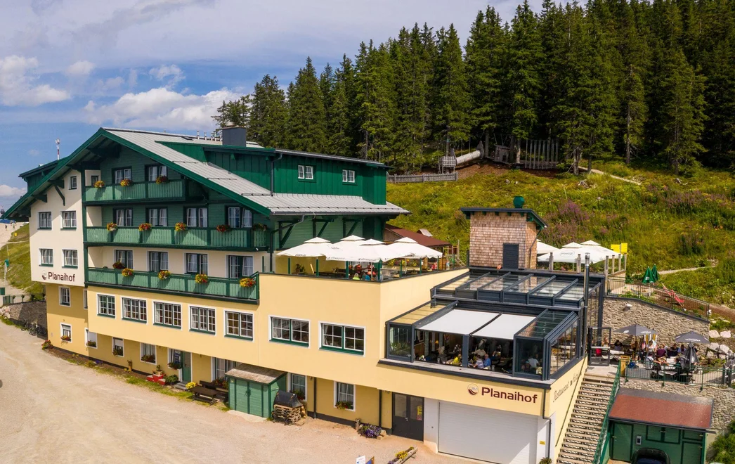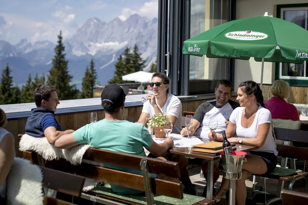 Our mountain restaurant offers hot meals all day long and our summer liqueur accompanies you with national and international wine and beer specialties. From the panorama terrace and our new winter garden, you are able to enjoy fantastic panoramic views of the Dachstein, Ennstal valley and Niedere Tauern mountains.