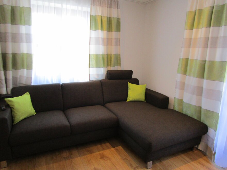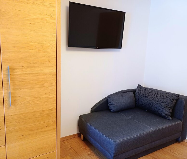 Big double or family room with entrance hall, shower and toilet, seating corner with pull out couch for 1 adult or 2 children,