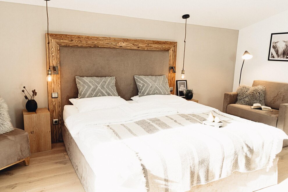 Our new and modern designed suite "am Gipfel"with wooden floor and balcony, separate sleeping area and separate living room with sofa bed for up to two persons, offers you relaxed, comfortable living.