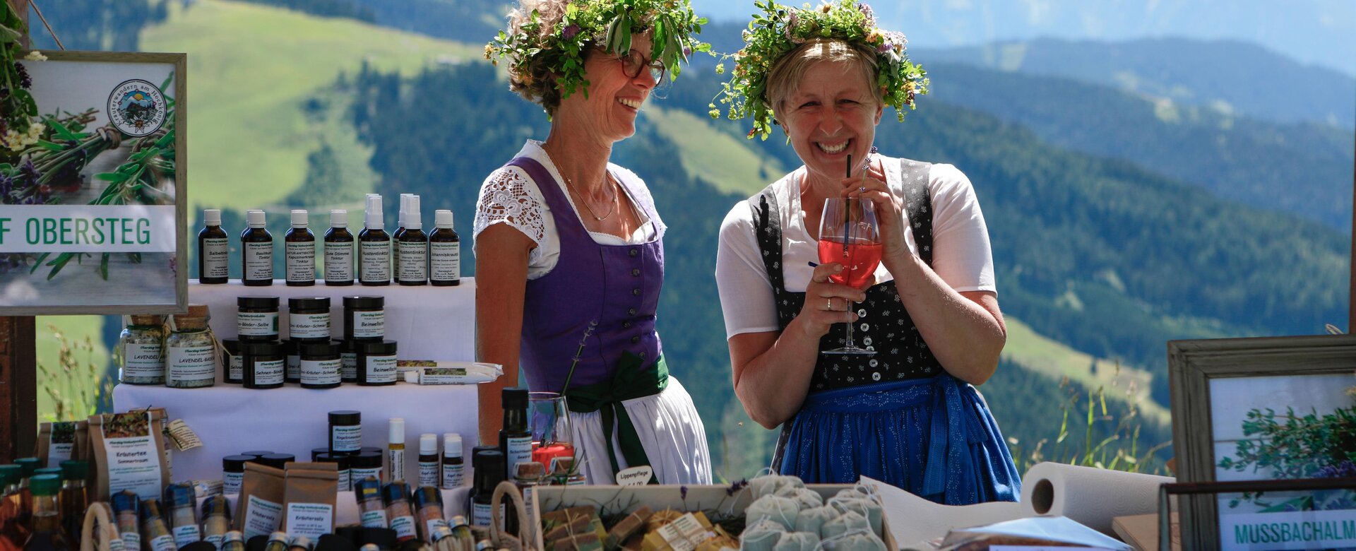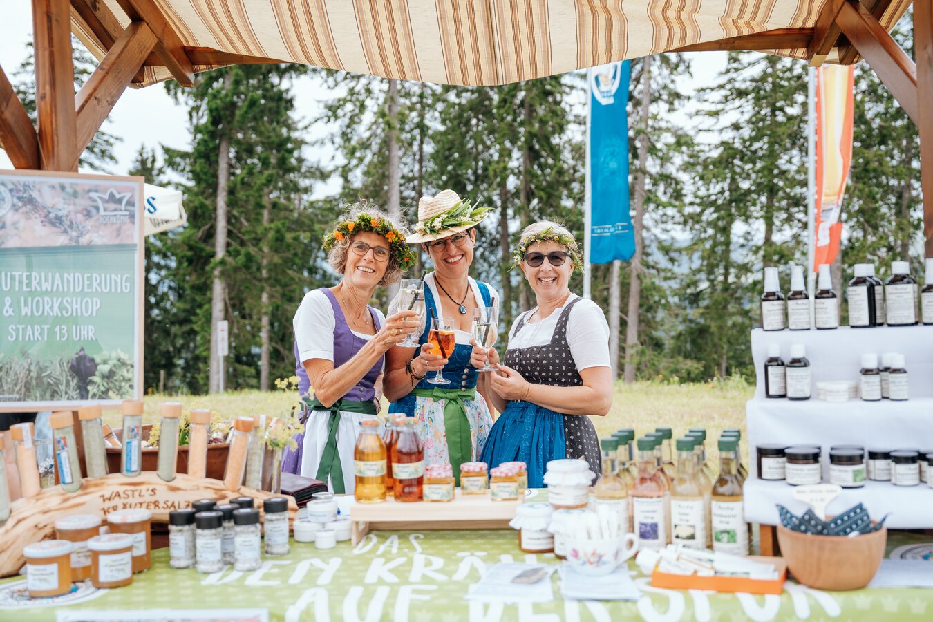 Three women in dirndls with flower crowns present herbal products at the Hochkönig herb festival. | © Miriam Lottes