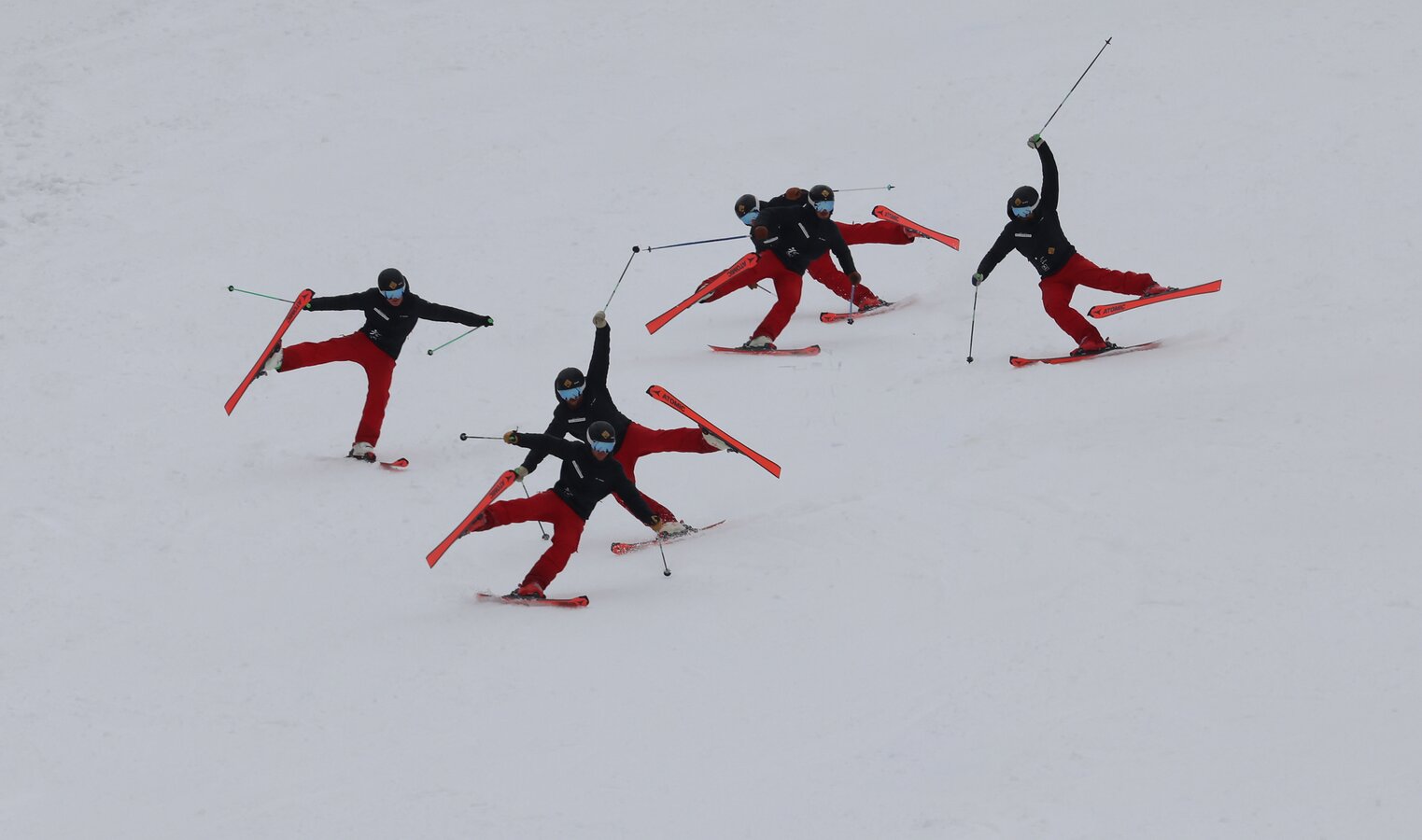 Five skiers perform synchronized lift moves with arms and legs extended on the slope | © Michael Simonlehner