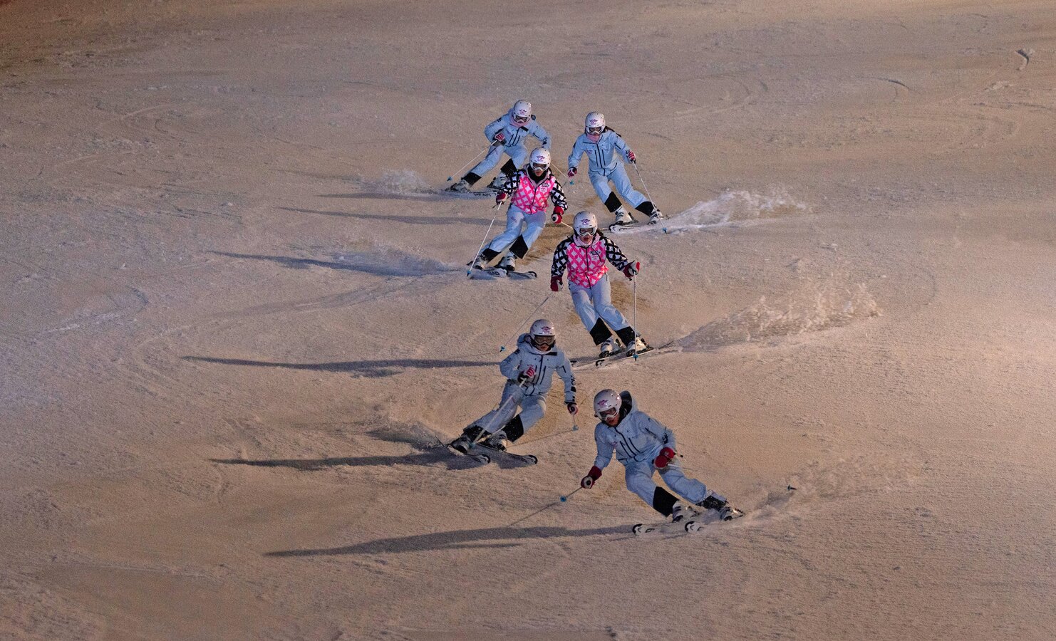 Seven skiers in formation skiing downhill on a slope lit by artificial evening light | © Michael Simonlehner