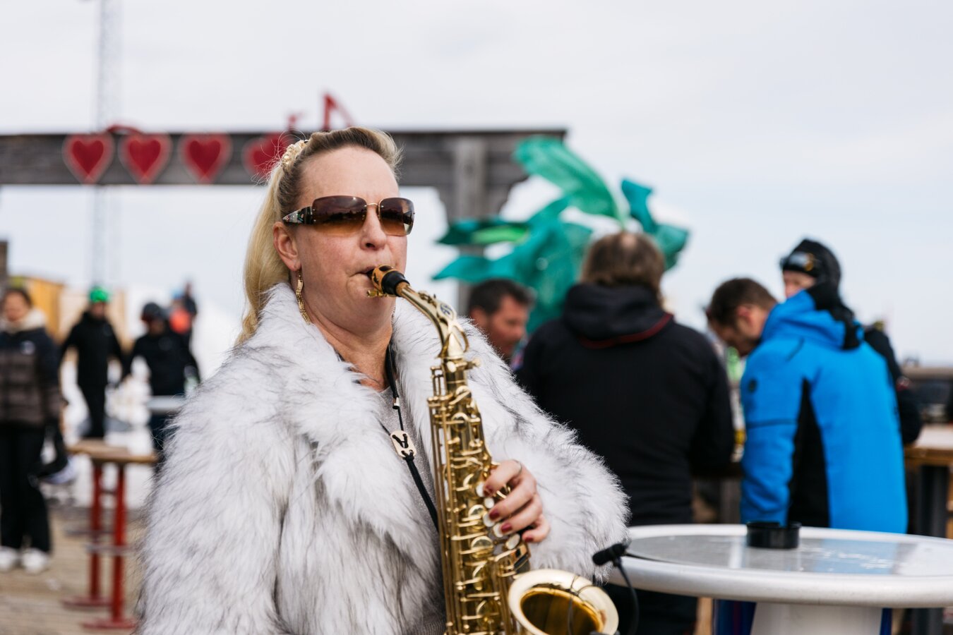 Woman in sunglasses and fur jacket plays saxophone at outdoor event on Reiteralm ski mountain | © Gerald Grünwald