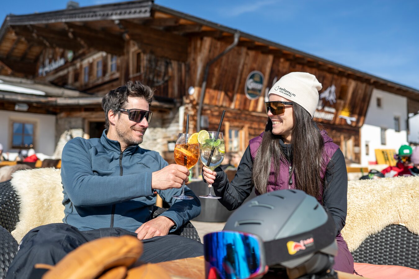 Man and woman toast with drinks in the sun, mountain hut and ski helmet in the background | © Lorenz Masser