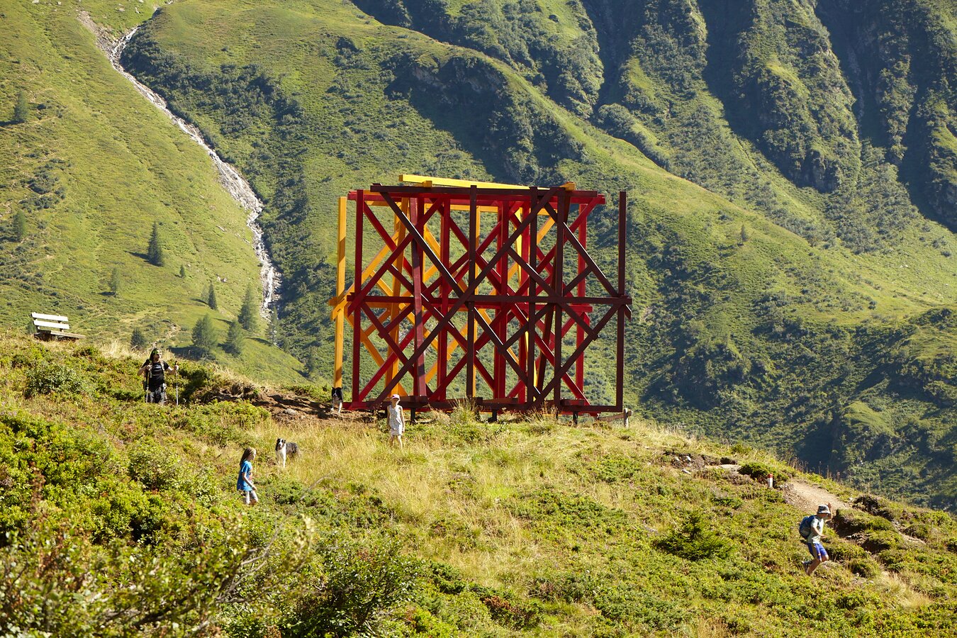 Large wooden structure in red-orange tones stands in the middle of the mountain | © Florian Kolmer