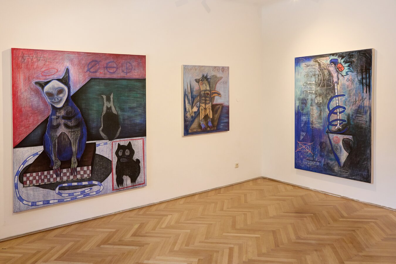 Three expressive paintings by Pascal Koertel displayed in a gallery room with wooden floor and white walls | © Florian Kolmer