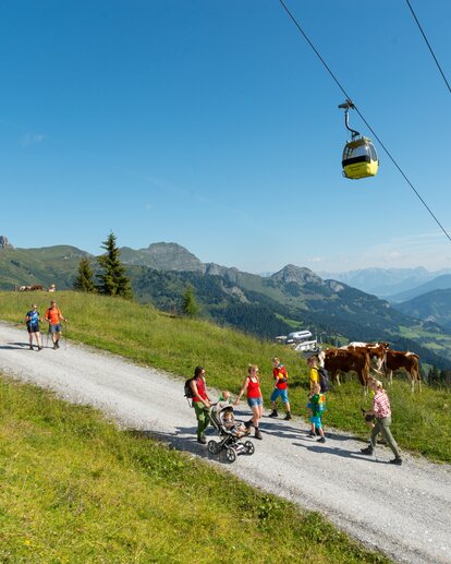 People walk up the mountain on a gravel road under a cable car | © Gruber Michael