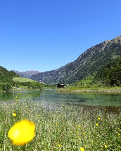 Sunny alpine meadow with yellow flowers by a clear lake at the valley end of Hüttschlag, surrounded by forests and mountains. | © TVB Großarltal
