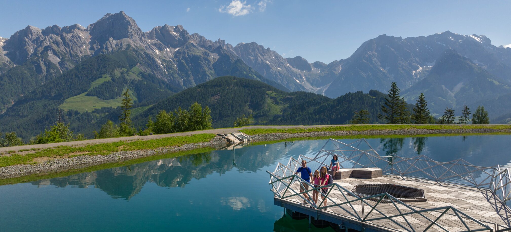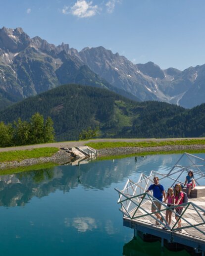 Family on wooden platform at Prinzensee in Maria Alm, clear lake water and Hochkönig mountains in background | © Roland Haschka