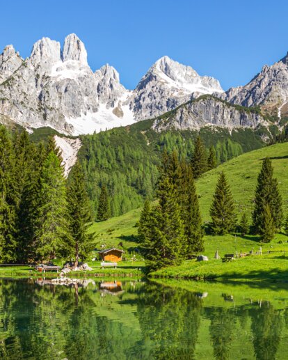 Crystal-clear Almsee reflecting the Bischofsmütze mountain, green meadow and forest in summer near Filzmoos, Austria | © CoenWeesjes