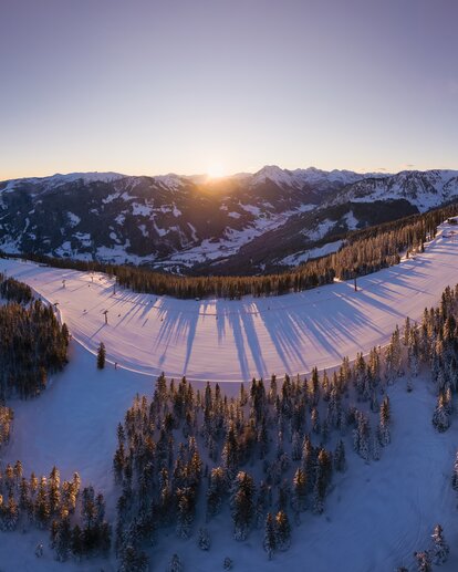 View of snowy slopes at Grafenberg with sunrise, snowy trees and mountain panorama | © Snow Space Salzburg