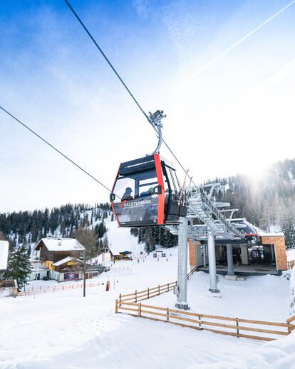 Red Galsterberg gondola above top station with snowy landscape. | © Josh Absenger