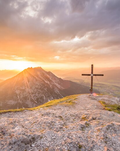 Summit cross at sunrise overlooking Gröbming area, mountain scenery bathed in golden morning light | © Christoph Huber
