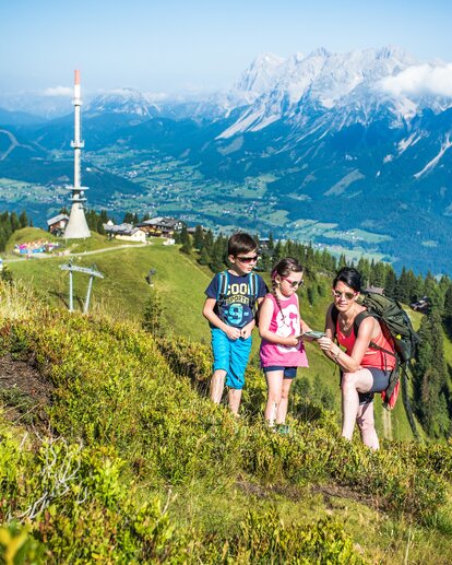Woman hiking with two kids at Hauser Kaibling with mountain panorama | © TVB Haus-Aich-Gössenberg-René Eduard Perhab