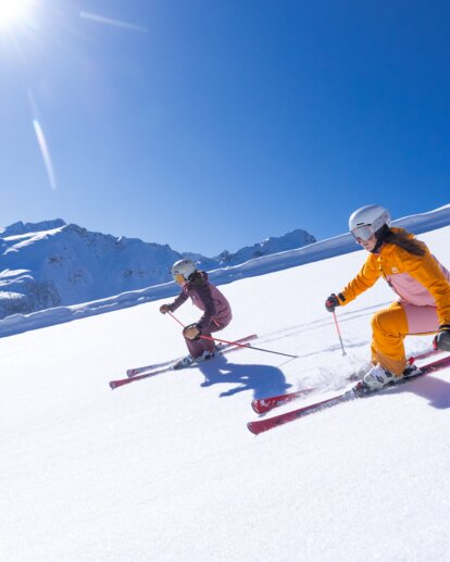 Two skiers ride in the sun on a groomed slope covered with fresh snow. | © Hauser Kaibling