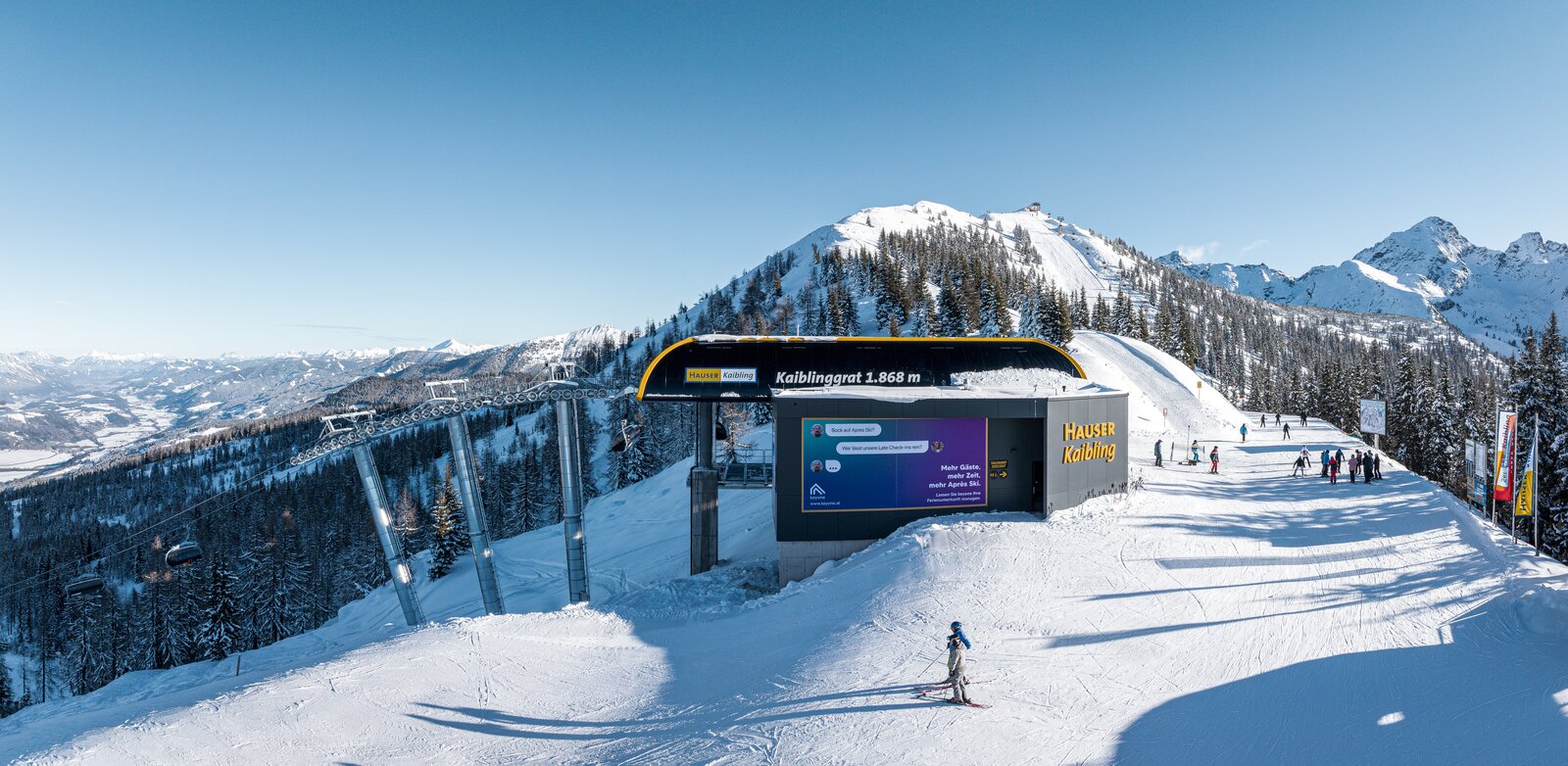 The 10-person gondola lift ‘Senderbahn Hauser Kaibling’ from cable car manufacturer Leitner offers an efficient and comfortable connection with a capacity of 2,800 people per hour and a speed of 6 m/s.