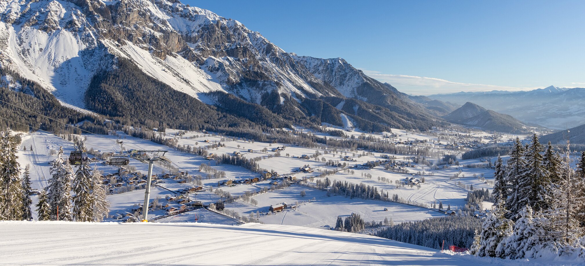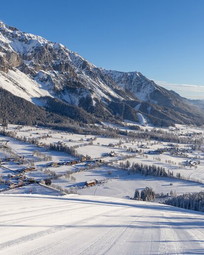 View from groomed ski slope of snowy Enns Valley and striking mountain backdrop.